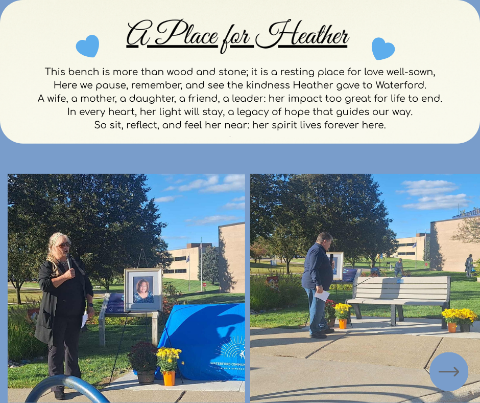 What started as a simple idea — to dedicate a memorial bench in Heather’s honor, quickly grew into a community-wide effort. The #HeatherStrong Fundraiser, organized by the Waterford Community Coalition, not only made the bench possible but also funded local student scholarships in Heather’s name.